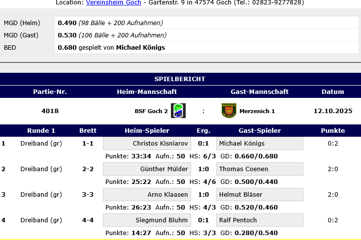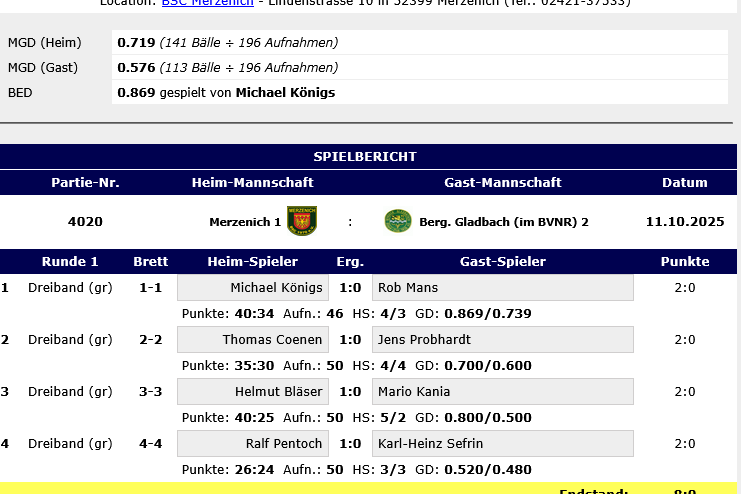 Am 11.10.2025 trat die Oberligamannschaft des BSC Merzenich 1 im Dreiband gegen Berg. Gladbach im Billardverband Niederrhein zu Hause an.…