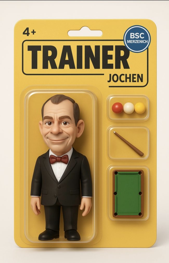Jochen jetzt auch für unsere kleinen Fans der Karamboltechnikdisziplinen. Kalle Schmitz, Mitglied aus Jochens sogenannter Technik-Krabbelgruppe, hatte die clevere Idee, seinen Trainer mittels IT, als Merchandise-Artikel zu generieren. Seht selbst, es ist ihm hervorragend gelungen! Einzig der Pooltisch bedarf noch einer Bearbeitung.   Thomas Skora