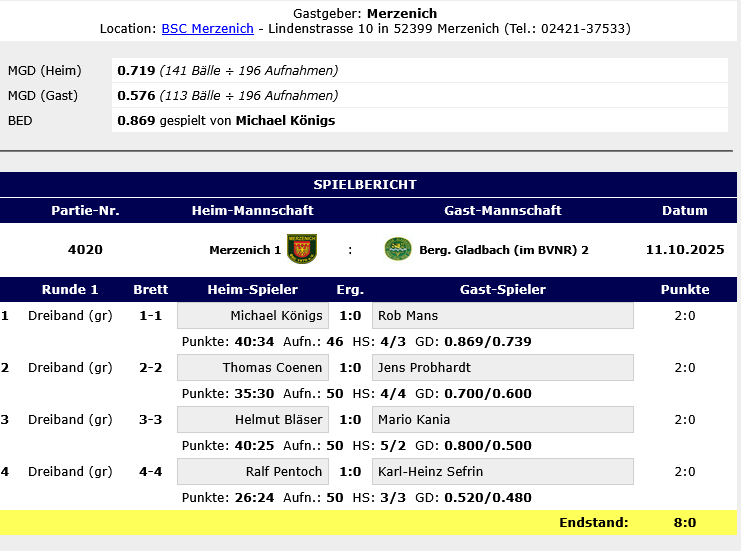 Am 11.10.2025 trat die Oberligamannschaft des BSC Merzenich 1 im Dreiband gegen Berg. Gladbach im